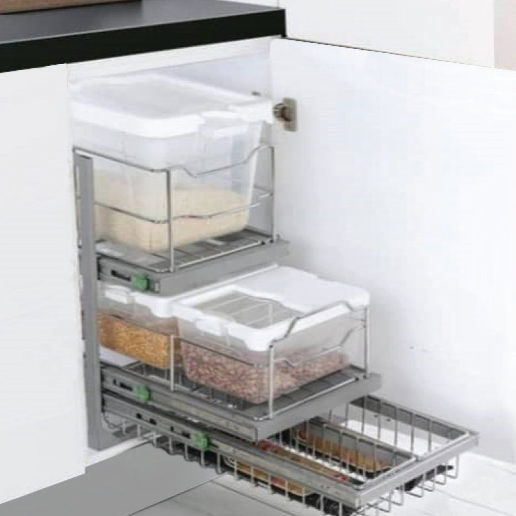 این سبد کشویی 3 طبقه داخل کابینت قرار میگیرد و به شما اجازه میدهد حبوبات و برنج خود را در ظرف ها درپوشیده منظم کنید یه طبقه توری در زیر آنها قرار گرفته که میتوان وسایل کوچکتر را در آن جای داد.